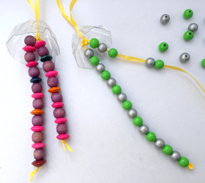 Material für eine Qualle: ein Eierkarton oder eine Eierschachtel aus Kunststoff, Schere, zwei große Wackelaugen, zwei Bänder, etwa 30 Holzperlen, Handbohrer oder Nagelschere, Cuttermesser Permanentmarker sowie Kleber.