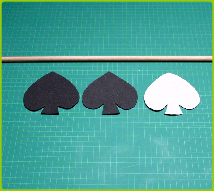 5. Schritt: Für welche Spielfarbe entscheidet ihr euch? Wir haben uns für Pik entschieden. Damit man einheitliche Blätter erhält, lohnt es sich eine Schablone anzufertigen. Wer das Kartenblatt nicht frei Hand zeichnen möchte, wird in der Google Bildersuche fündig. Dort gibt es jede Menge Vorlagen. Nachdem man eine Schablone aus Pappresten gebastelt hat, überträgt man die entsprechende Anzahl auf das schwarze Moosgummi. Nicht vergessen: Auf je einer Seite der Spielkarte kommt die Spielfarbe.